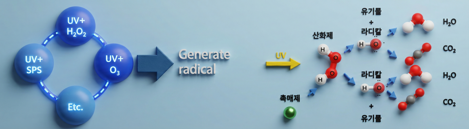 UV AOP란 자외선(UV)과 산화제를 통해 라디칼(일반적으로 ‘OH 라디칼’)을 생성하여 수중의 유기 오염물질을 산화 분해하는 공정입니다.
